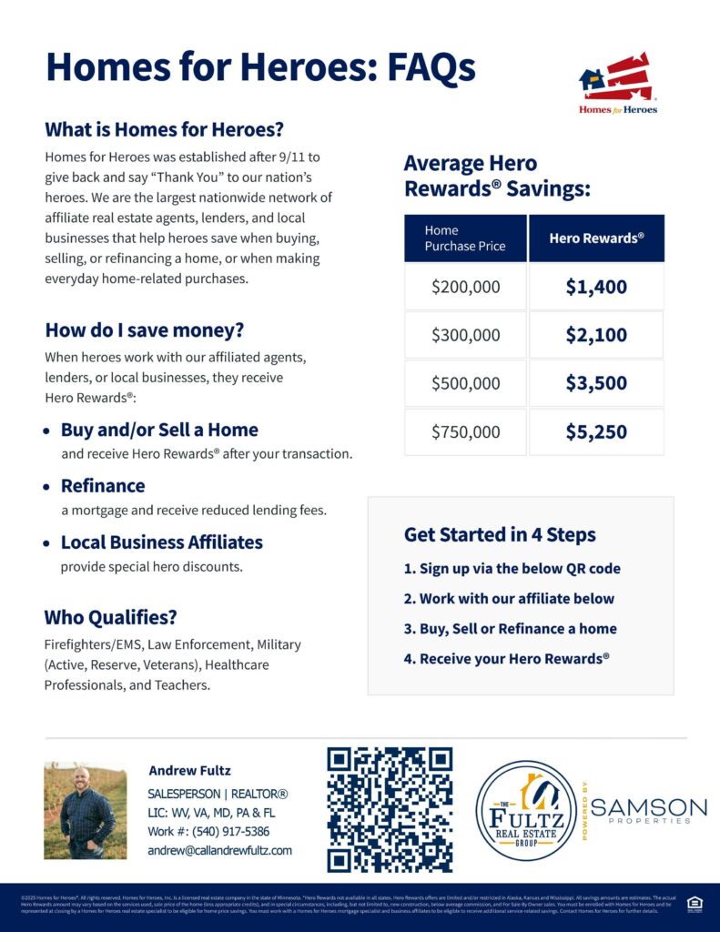 By working with me you can receive significant savings through the Homes for Heroes program. We’re helping firefighters, EMS, law enforcement, military active duty and veterans, healthcare professionals and teachers save an average of $3,000 when they buy or sell a home – $6,000 when they do both! Myself, along with my local partners, will guide you through the process and maximize your savings potential. Consider it our way to say, thank you for your service.